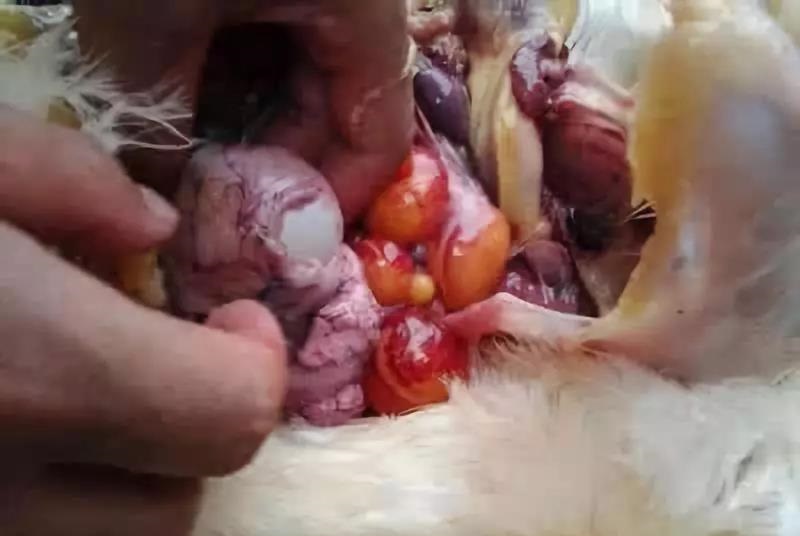 十二指腸黏膜粗糙,內(nèi)附黃油狀物,十二指腸末端腸黏膜上有條狀出血性腫脹。十二指腸及小腸黏膜上有火柴頭及筷子頭大小的出血性壞死性病灶。個別雞小腸黏膜脫落,腸腔內(nèi)充滿氣體,內(nèi)含未消化的飼料。輸卵管黏膜呈乳黃色,皺褶變厚,內(nèi)分泌物增多,輸卵管下端呈暗紅色,黏膜粗糙。泄殖腔黏膜有點狀或片狀出血,泄殖腔內(nèi)有黃白色、或黃綠色稀糞。盲腸扁桃體腫大,出血性壞死,直腸黏膜有細砂樣出血點。其他臟器基本正常,僅有個別病死雞肝臟、脾臟腫大,被膜下有灰白色或灰黃色針鼻大的壞死點。